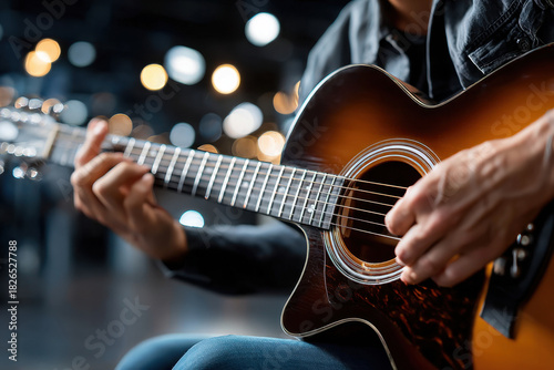 Closeup of hands playing acoustic guitar on blurred background