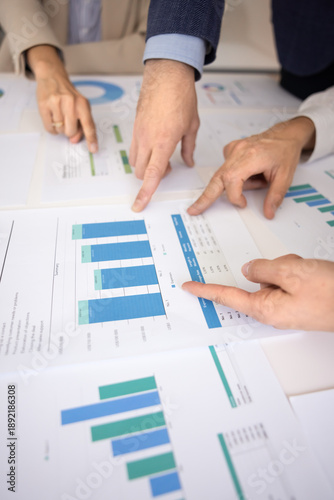 Close-up of hands pointing at diverse bars and figures on printed financial charts laid out on conference table, collaborate, analyze data trends, discussing key performance indicators during meeting