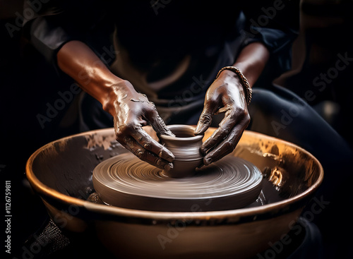 Close-up of hands shaping clay on a potter's wheel, showcasing the artistry and skill involved in pottery creation. The scene is dimly lit, emphasizing the hands and the process.