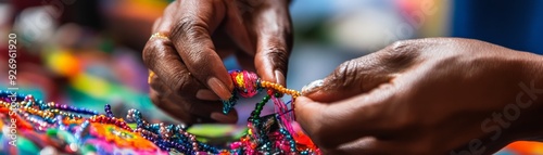 Close-up of hands threading colorful beads for jewelry making, highlighting the intricate details of craftsmanship and creativity.