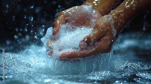 Close-up of hands washing with soap and water, creating a splash.