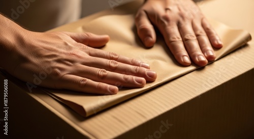 Close-up of hands wrapping a brown paper package on a wooden surface with soft lighting.