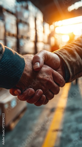 Close-up of Handshake Between Two Individuals in Warehouse at Sunset