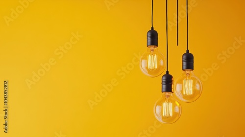 Close-up of hanging vintage light bulbs with glowing filaments, set against a bright yellow background symbolizing creativity and ideas.