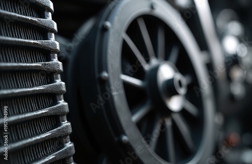 Close-up of heavy machinery engine radiator and fan. Industrial metal part for cooling power generation equipment. Intense mechanical engineering detail.