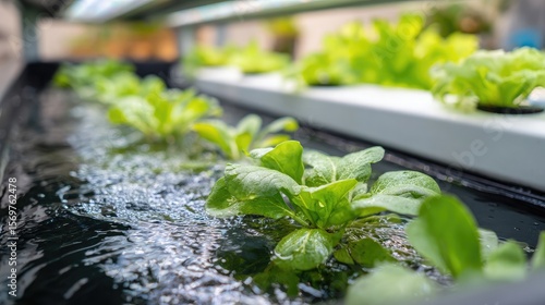 Close-up of hydroponic grow system with leafy vegetables in nutrient solution