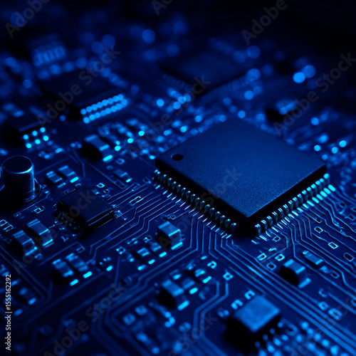 Close-Up of Illuminated Circuit Board with Blue LED Lights