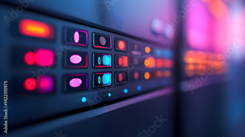 Closeup of Illuminated Server Control Panel with Neon Lights