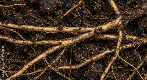 Close-up of intricate tree roots embedded in rich, dark soil showcasing organic textures