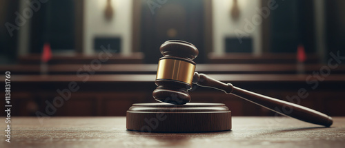 Close-up of judge gavel resting on wooden block in courtroom setting, symbolizing justice and law.