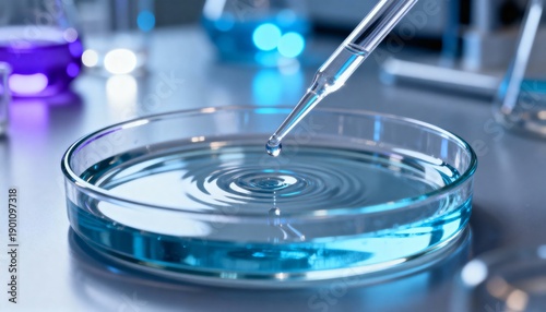 Close-up of laboratory pipette dropping liquid into petri dish with blue solution for scientific research and biotechnology testing.