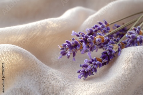 Closeup of lavender flowers on soft beige fabric
