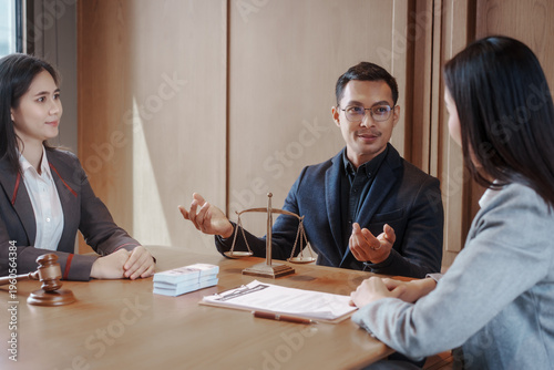 Close-up of legal consultation meeting with attorneys at desk, scales of justice and gavel in focus, paperwork in foreground, warm office light.