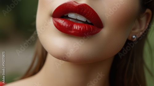 Close-up of luscious red lips, glossy and perfectly defined, capturing the essence of beauty and elegance with a striking, bold shade.