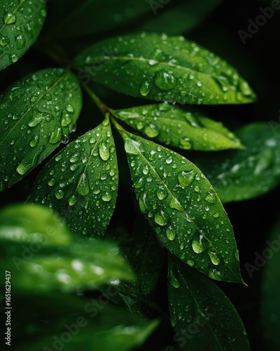 Close-up of lush, dark green leaves glistening with numerous water droplets after rain