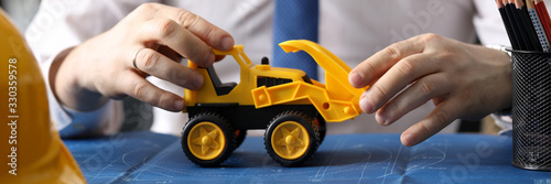 Close-up of male hands with yellow backhoe loader. Architect driving small excavator and showing plans of restructuring of city. Business and construction concept