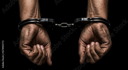 Close-Up of Man’s Hands in Metal Handcuffs, Tense Expression, Dramatic Black Background.