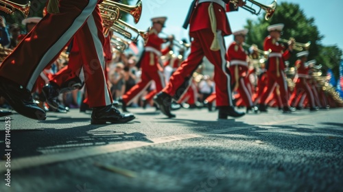 Close-up of marching band in bright red uniforms playing brass instruments during 4th of July parade, capturing the festive spirit and patriotic pride.