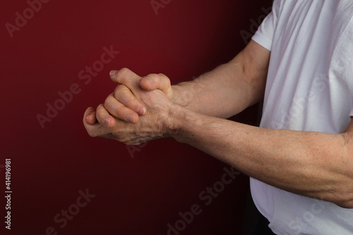 close-up of middle-aged male hand, applying a moisturizing, rejuvenating hand cream, disinfection of skin during viral epidemic, medical, cosmetology concept