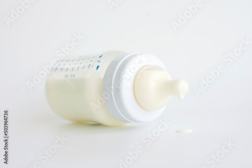 close-up of milk drops on a baby feeding bottle teat