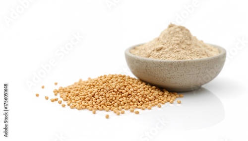 Close-up of millet and sorghum seeds alongside their ground flour in a bowl, focused detail