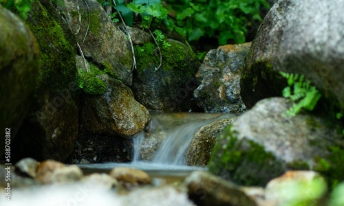 Closeup of mossy stones in a river