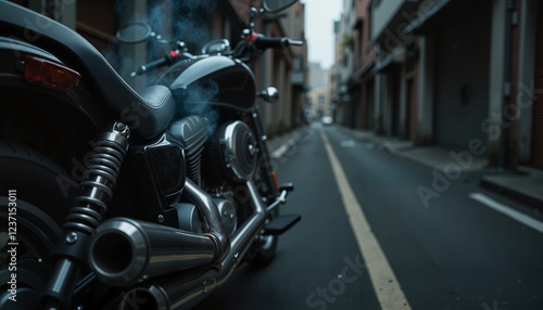Close-up of motorcycle exhaust pipe releasing smoke in urban alley, pollution