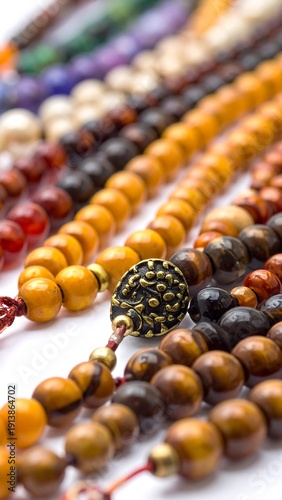 Close-up of multiple strings of prayer beads in varying colors, textures, and materials, on a white surface