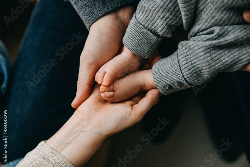 Closeup of newborn baby feet in fathers and mothers hands. Young family concept.