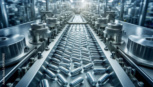 Close-up of pharmaceutical capsules moving on a modern automated production conveyor line inside a sterile medicine container; Mass medical production concept.
