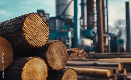 Close-Up of Piled Logs with Industrial Background in Sawmill Setting : Generative AI