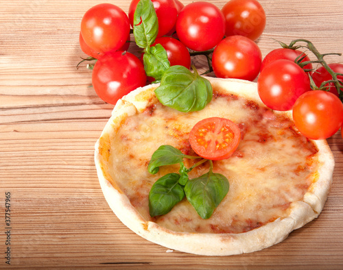 Closeup of pizza with tomatoes, cheese and basil on wooden background
