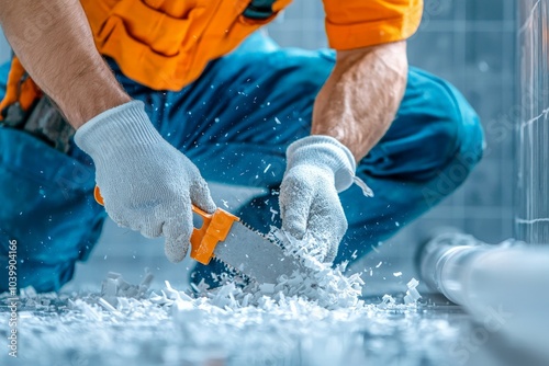 Close-Up of Plumber Cutting Pipe with Gloved Hands