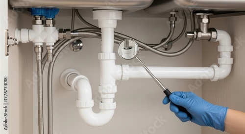 Close-up of plumber’s hands repairing drain pipe under sink, suitable for DIY or professional repair content.