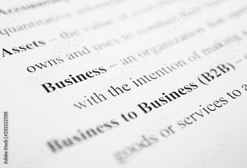 Closeup of popular business-related terms and their respective definitions on the white paper.