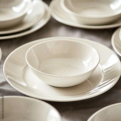 Close-up of pristine white dinnerware, plates and bowls