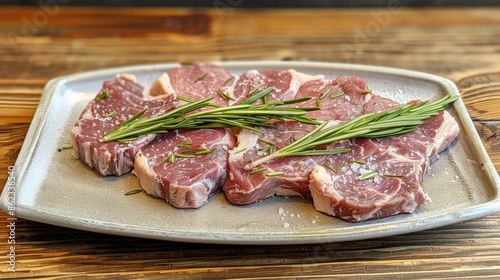 Closeup of raw premium lamb cuts seasoned with fragrant rosemary and garlic served on a rustic wooden plate This savory protein rich dish is a tempting entree for any gourmet or homemade meal