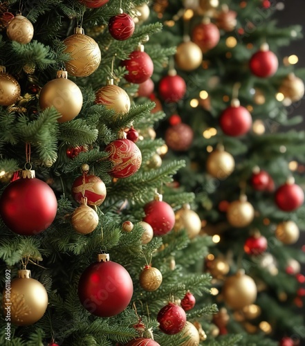 Close-up of red and gold decorations on Christmas tree, traditional decor, festive holiday spirit, Christmastime glow