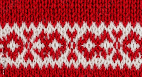 Close-Up of Red and White Nordic Knit Fabric, Intricate Textured Pattern in Vibrant Red and Cream-Colored Knitted Wool