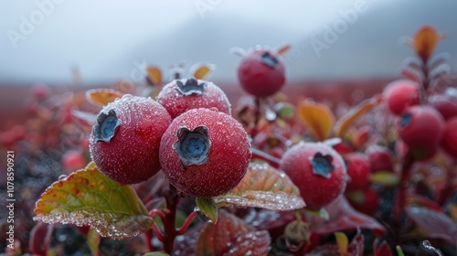 Close-up of red berries with frost on a cold morning, with a foggy background.