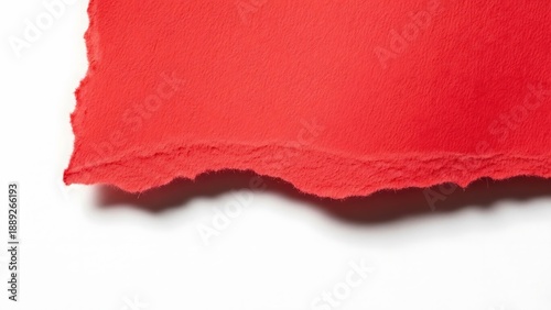 Close-up of ripped red paper with jagged edges against white background, simple and graphic