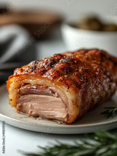 Close-up of roasted pork belly with crispy skin on a plate.