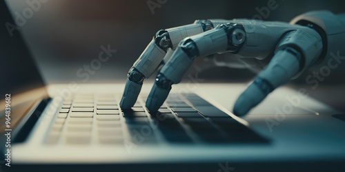 Close-up of Robotic hand pressing a keyboard on a laptop 3D rendering style. Concept of artificial intelligence ai, modern technologies