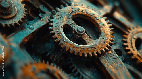 Closeup of rusty cogwheels interlocked in a complex machinery.