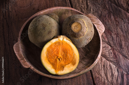 closeup of sapote fruits in a wooden bowl