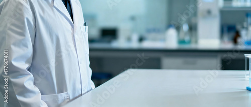 Close-up of scientist or doctor in white lab coat standing in front of clean laboratory counter, with blurred background.