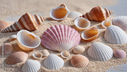Close-up of sea shells on a neutral sandy background