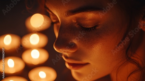Close-up of serene woman's face illuminated by candlelight.