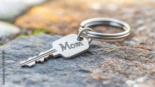 Close-Up of Silver Key with Mom Engraving on a Rustic Stone Surface