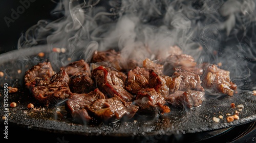 Close-up of sizzling grilled steak with smoke.